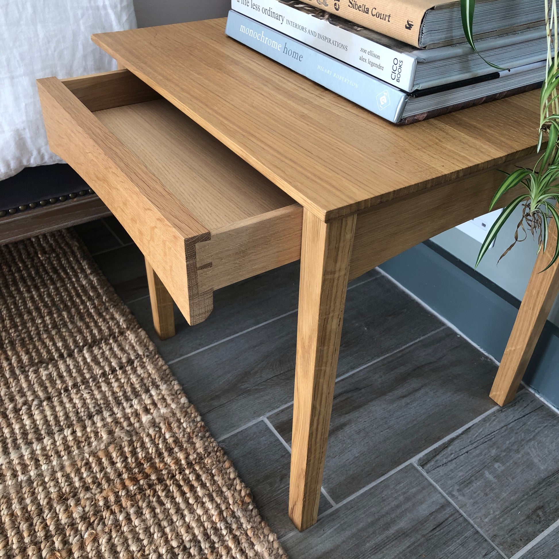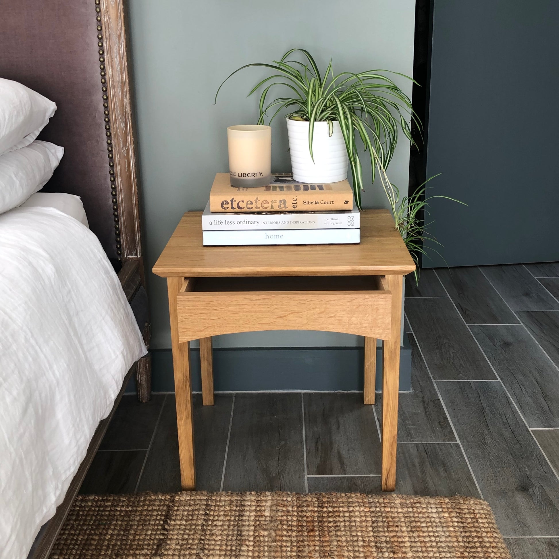 This elegant solid oak bedside table with a hidden drawer offers both style and practicality. Its tapered legs and smooth, curved side rails create a refined, understated look. The drawer front is thoughtfully curved to match the side rails, seamlessly blending into the design when closed. A perfect blend of form and function, this table adds a subtle yet sophisticated touch to any room, offering discreet storage with timeless appeal.