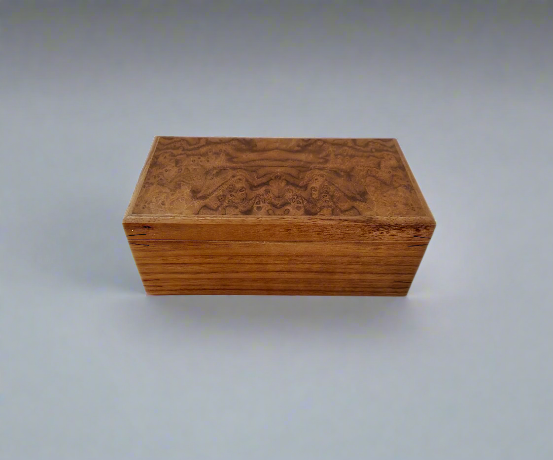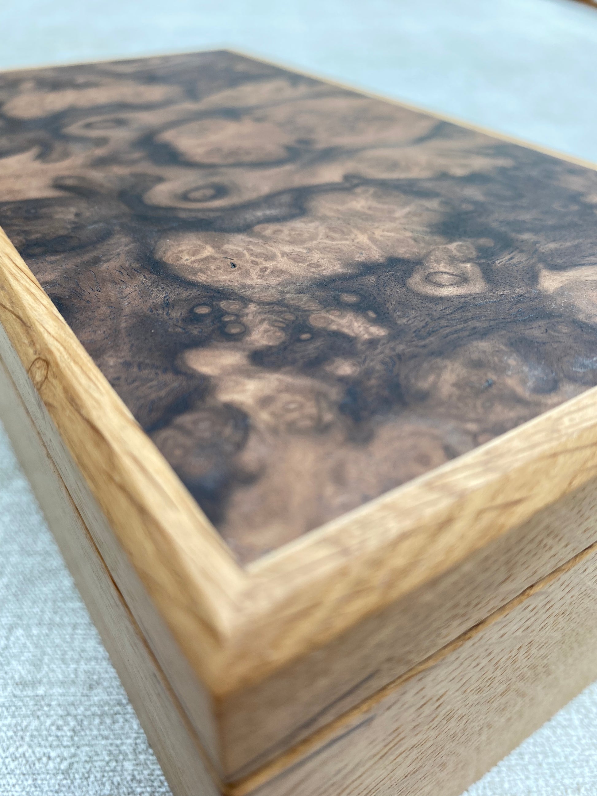 Designed to house your most cherished accessories, this handmade luxury watch and cufflink box features a book-matched burr walnut exterior, creating an attractive centrepiece. The ideal gift for the discerning gentleman, it offers a sophisticated home for a watch and cufflinks. Made to order, from sustainable woods.