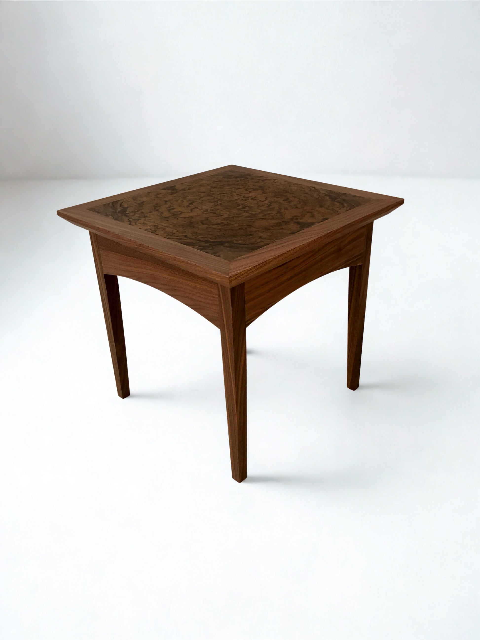 This elegant side table features a remarkable burr walnut tabletop, showcasing the natural beauty and unique grain patterns of premium wood. The book-matched grain pattern that creates a striking kaleidoscope effect, adding visual depth and beauty to the design. With tapered legs and expert craftsmanship, it blends timeless design with contemporary sophistication. Perfect for enhancing any living space as a side table or a bedside table, this luxury side table adds both function and beauty to your home.